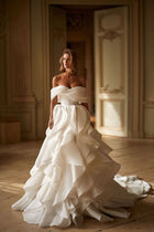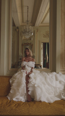 Fashionosta-worthy organza gown with whimsical frills. Featuring a heart-shaped bow-shaped off-the-shoulder bodice with a bow on the back, and an opulent voluminous maxi skirt made from dozens of organza layers each handcrafted into exquisite frills that dance and sway in captivating harmony with every movement.