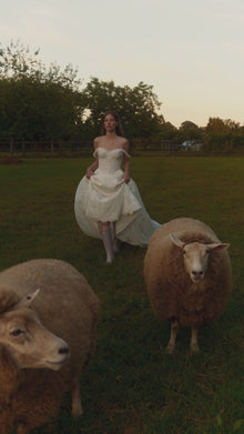 Romantic A-line wedding gown framed by straps crafted from delicate chantilly lace. Featuring a fitted semi-transparent drop-waist corset bodice with visible delicate boning, built-in cups, discreet zip-up closure, and a flowing A-line skirt with a scalloped hem and maxi train. Comes with floral, chantilly lace sleeves that offer a seamless transition from ceremony to reception. Enhance the look with the Elisora tulle veil for a beautifully finished ensemble. - Lighter and more comfortable than the Melrose gown. - Creates a slimming waist effect. - Longer than standard lengths — can be shortened along the lace hem. - Soft, pleasant inner lining. - Removable cups. - Stretch mesh corset allows flexible sizing.