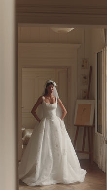 Romantic organza ball gown with wide straps, adorned entirely with delicate, subtle rosette patterns. The dress features a flattering square neckline supported by the wide straps, a fitted corset with visible boning for impeccable structure, and a zipper closure on the fully covered back. The voluminous skirt cascades gracefully into a dramatic, show-stopping train, creating a breathtaking silhouette. Complete the ensemble with a romantic Valeris hairband or classy Valeris gloves for a beautifully finished look. - Suitable for all bust sizes, including D+. - Extremely light and comfortable.