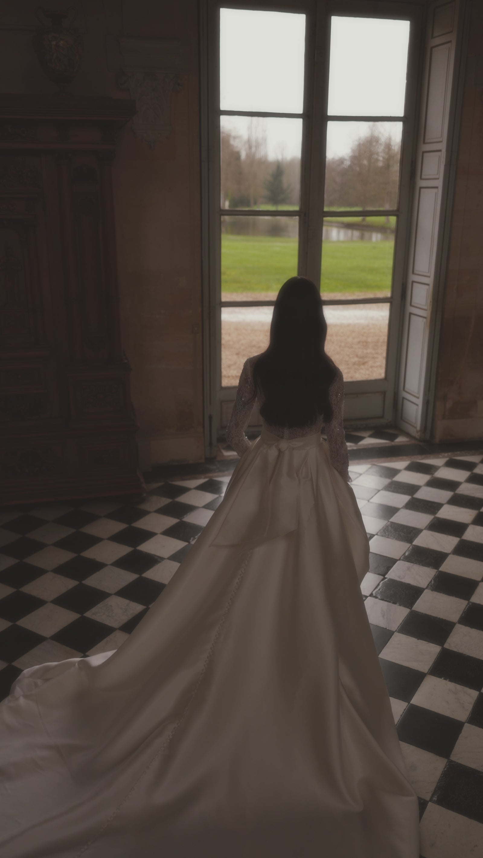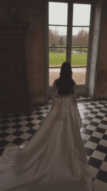 Extraordinary combination of an embellished chantilly lace long-sleeved turtleneck bodice and a chic maxi mikado skirt. The bodice has a closed buttoned back and is fully embellished by hand with sequins and beadings. The skirt is adorned with an accented belt on the waist that twists into a bow at the back.