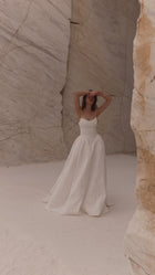 The design features a corset-style drop-waist bodice with delicately draped off-the-shoulder sleeves, a cinched waist with a sewn-in doubled corset that ensures a seamless, flattering fit, a zip or lace-up closure on the back, and an asymmetrically draped skirt. The gown culminates in a full maxi skirt with a sweeping maxi train. Pair with opera-length Lady Di gloves, and the silhouette transforms into a vision of timeless elegance.