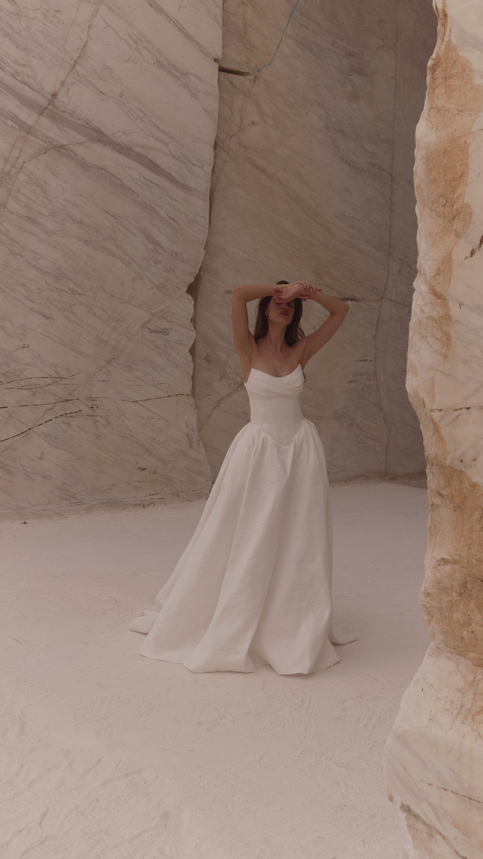 Posh A-line wedding gown crafted from jacquard with an exclusive one-of-a-kind intricate swirling floral pattern in embossing technique.