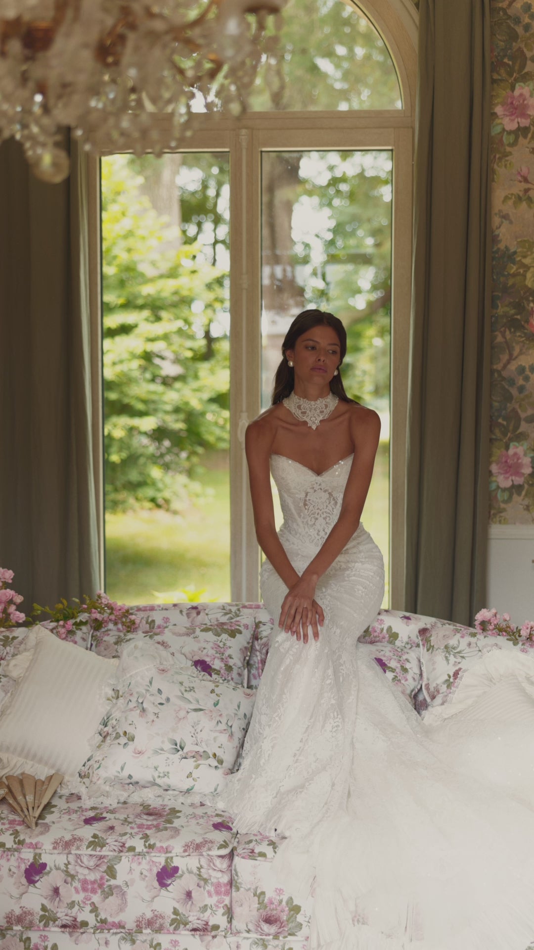 Strapless mermaid wedding gown fashioned from delicate chantilly lace. Designed with sheer lace over nude lining, a structured corset-style bodice, and a fitted long skirt with a subtle train. Comes with a matching long-sleeved bolero.