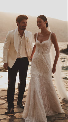 Delicate yet showy mermaid wedding gown fashioned from semi-sheer lace intricately adorned with shimmering sequins. Featuring a heart-shaped neckline framed by structured straps, the gown boasts a boned corset bodice with built-in cups and visible semi-sheer inserts that visually flatter the figure for an ultra-chic touch. The figure-hugging maxi skirt flows effortlessly with a nude underlayer, finishing with a delicate short train.