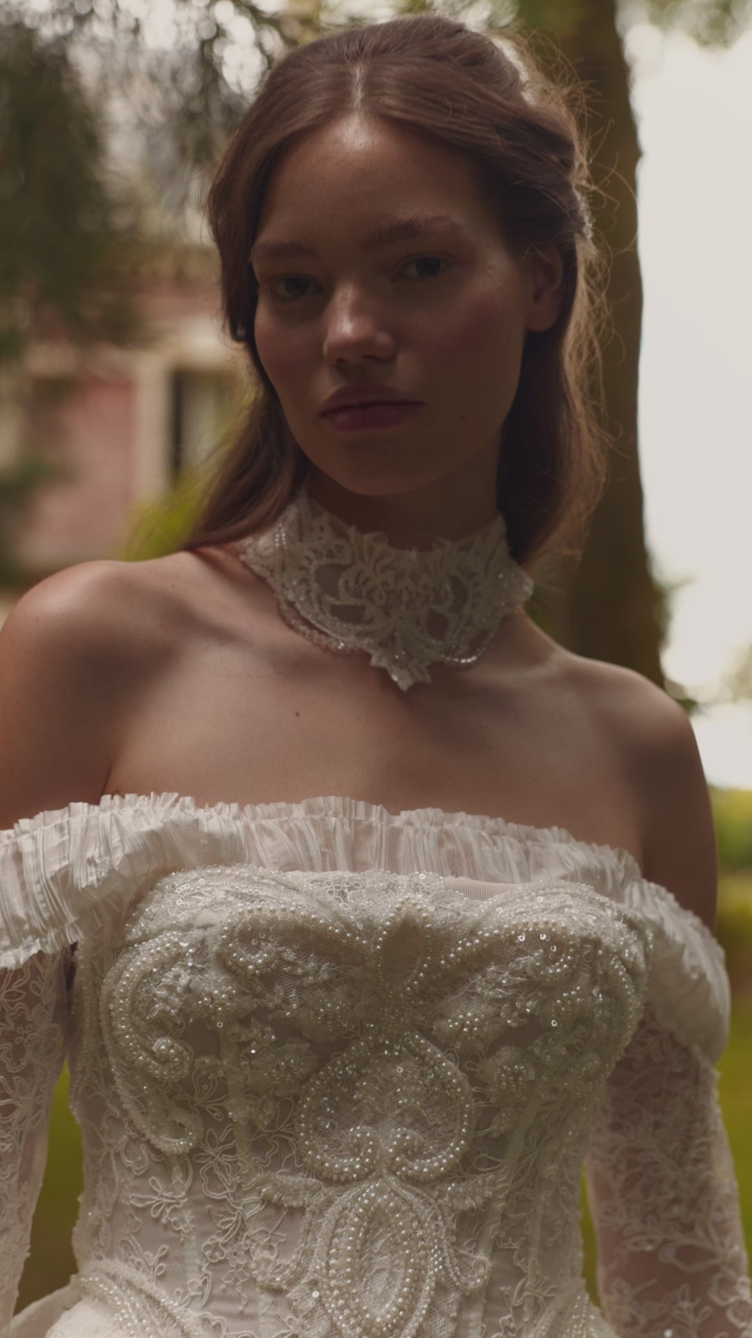 Romantic off-the-shoulder A-line wedding gown, lavishly adorned with intricate floral motifs and shimmering embellishments. The structured corset bodice сinches the waist for a beautifully defined silhouette, while a straight neckline and delicately ruched off-the-shoulder detachable straps highlight the clavicle line. The voluminous princess-style skirt flows gracefully to the floor, extending into a long sweeping train. Pairs perfectly with the matching lace Qirelle long sleeves, adding an extra touch of romance. - Hand-embroidered, an elevated version of the Monica gown. - Internal fastening keeps the corset perfectly secure. - No lace trim at the hem — easy to shorten.